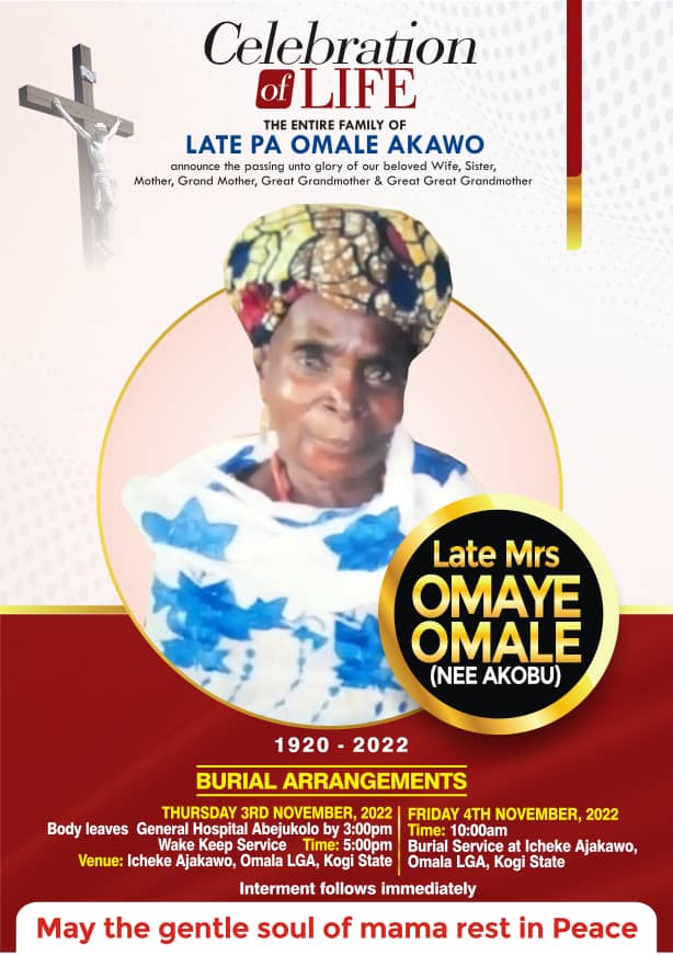 The family of Late PA. OMALE AKAWO wishes to say a very big thank you for taken part in one way or the other during the life, death and burial of our beloved grand mother, mother, sister and Aunt, Late Mrs. ÓMAYE OMALE (Nee Akobu).