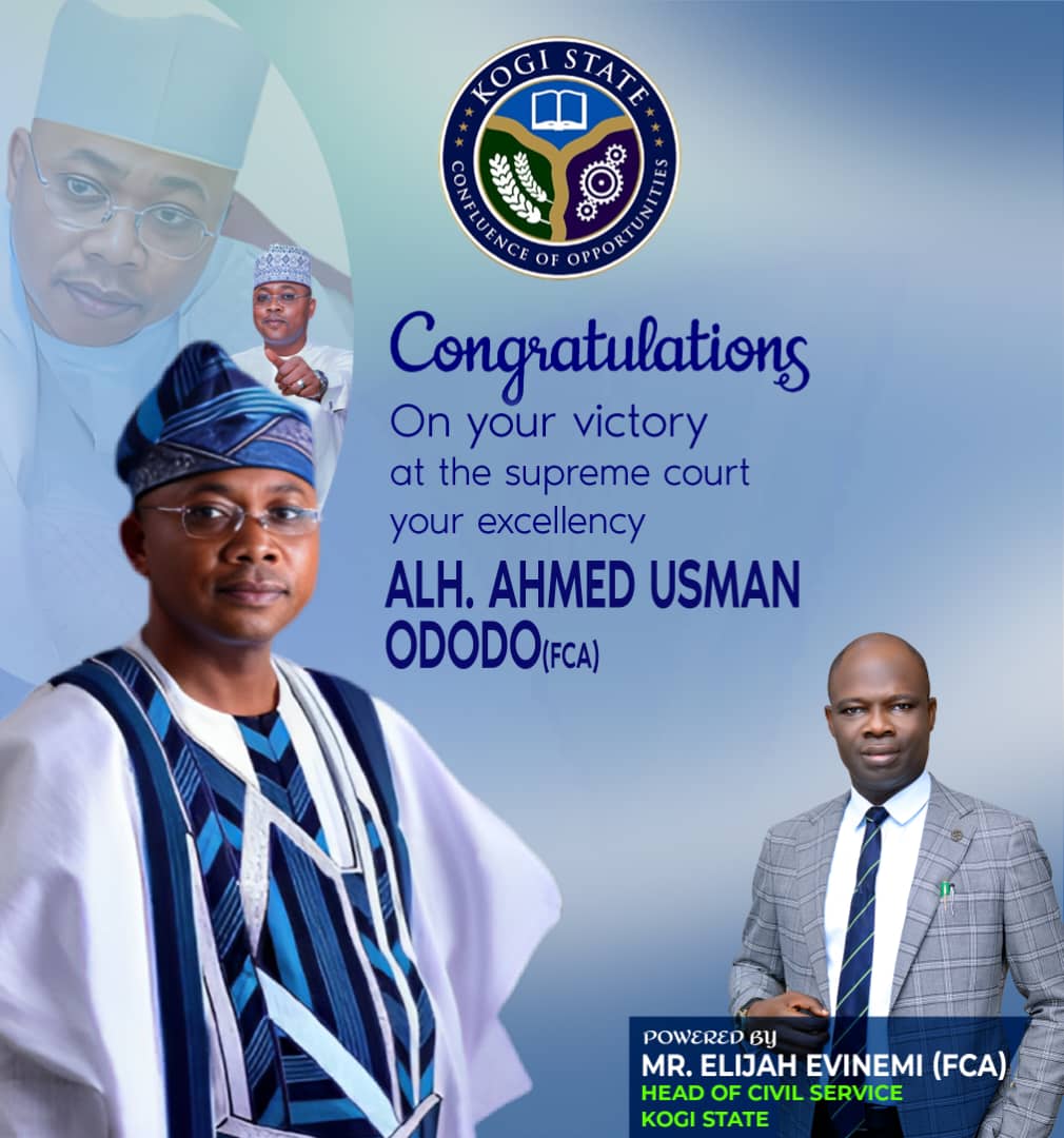 Your supreme Court victory, confirmation of people’s mandate — Kogi HoS The Kogi State Head of Civil Service, Mr Elijah Evinemi, has facilitated with Governor Alhaji Ahmed Usman Ododo on his Supreme Court victory, confirming his election as the duly elected Governor of Kogi State. Mr Evinemi, in his congratulatory message issued in Lokoja, emphasized…