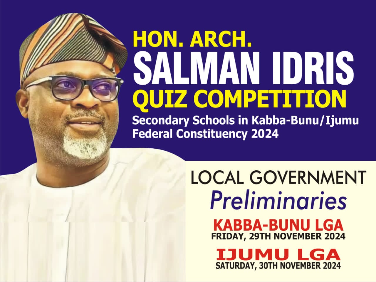 ……….Preliminaries Starts  Tomorrow with 20 Schools.   In line with the  avowed commitment to energise education through intellectual competition the conveners of the Kogi Built Environment and Building Materials Exhibitions has scheduled to host a quiz competition in honour of the  House of Representatives member for  Ijumu and Kabba Bunu Local Government Federal constituency, Arch….